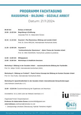 Wir freuen uns, euch am 21. November 2024 herzlich zur Fachtagung „Rassismus – Bildung – Soziale Arbeit“ im Bürgerhaus MüZe, Berliner Str. 77, 51063 Köln einzuladen. Diese Veranstaltung wird in …