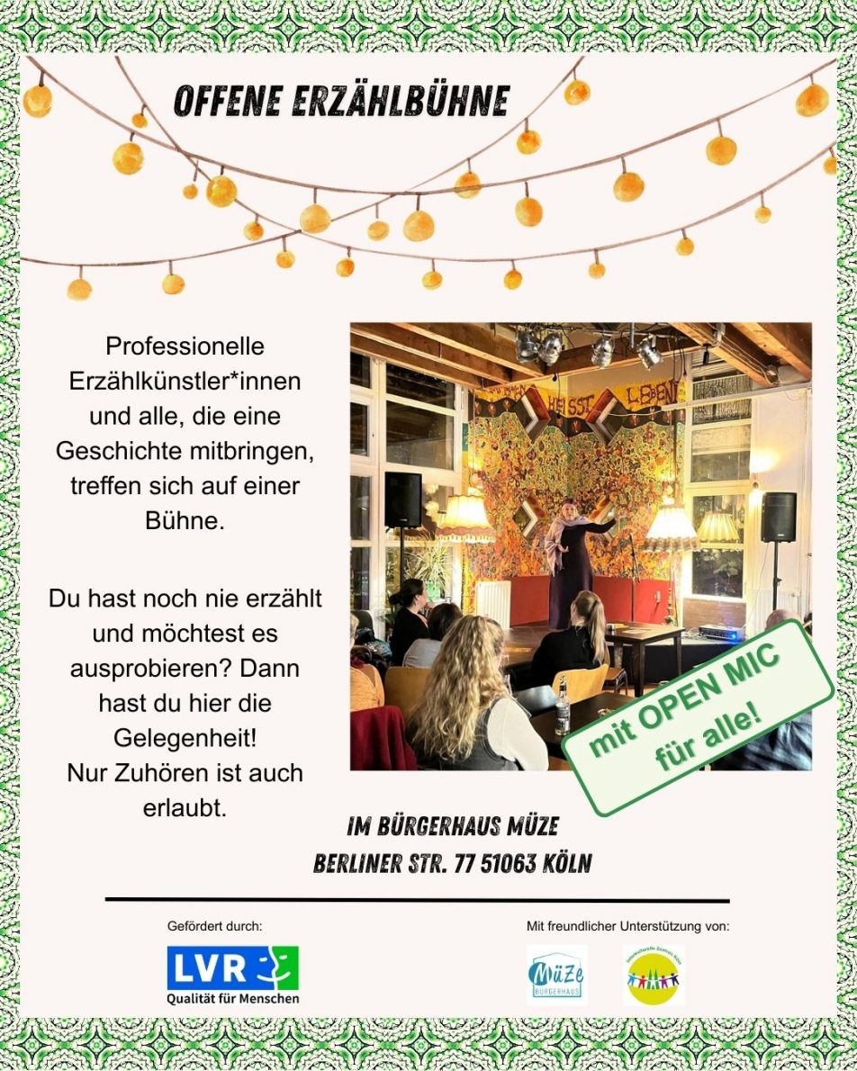 Auf der offenen Erzählbühne könnt ihr professionellen Erzählkünstler*innen lauschen und auch eigene Geschichten erzählen. Ivo Hewing startet am 13.03. mit seinen Geschichten vom Aufbruch ins Ungewisse. Wer Lust hat, kann sich an diesem Abend auch selbst im Erzählen ausprobieren. Die Bühne ist offen für alle. Der Eintritt ist frei. Erzählkunst ist UNESCO-Weltkulturerbe und wir geben ihr im Jahr 2026 einen Erzählraum – bei uns in Köln-Mülheim! An mehreren Freitagabenden erzählen professionelle Künstler*innen auf der “Offenen Erzählbühne” und es gibt die Möglichkeit, sich als Laie im Erzählen auszuprobieren. Im September findet außerdem ein großes Erzählfestival für Familien statt. Danke an die LVR – Regionale Kulturförderung. Die weitere Termine der Offenen Erzählbühne sind: