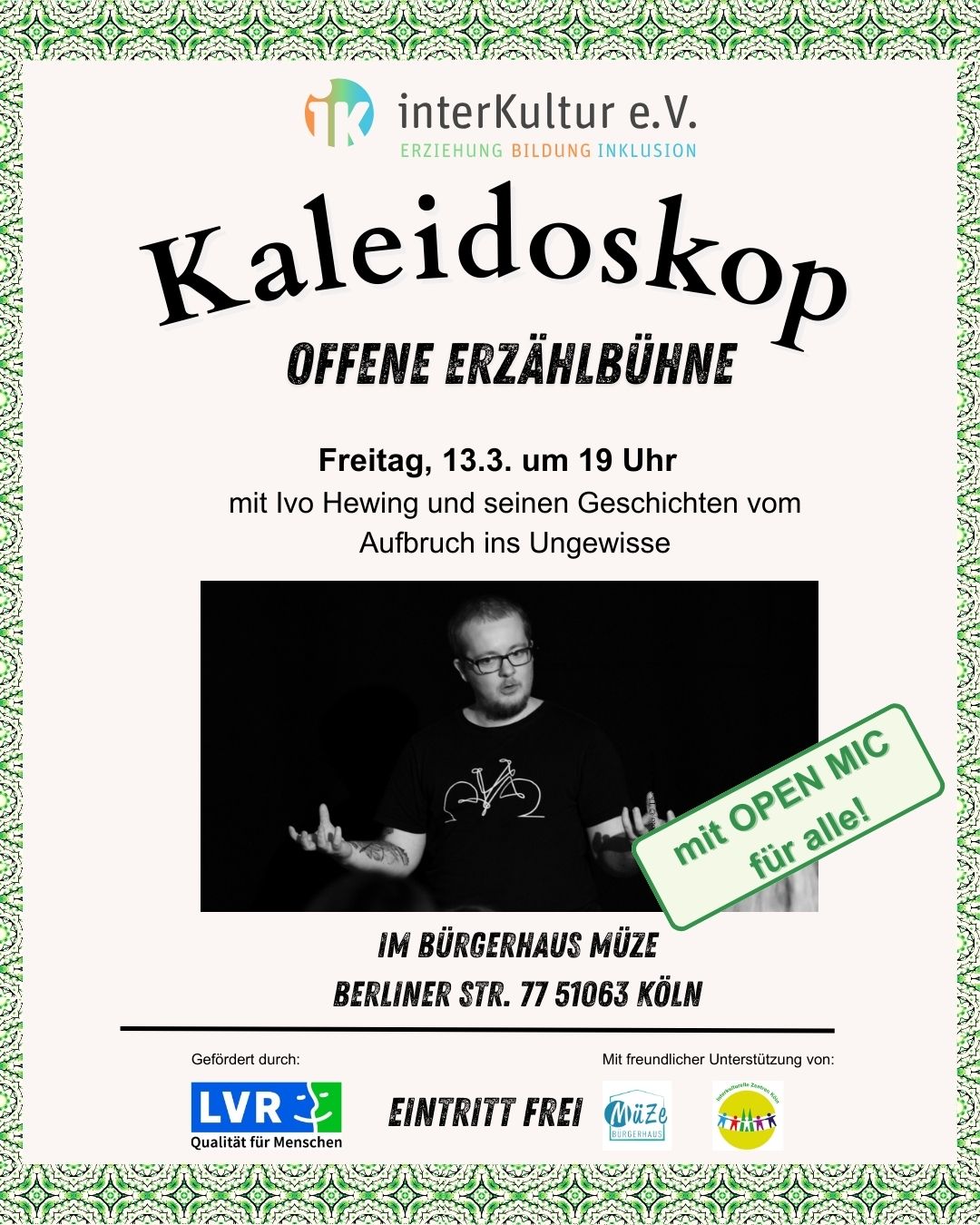 Auf der offenen Erzählbühne könnt ihr professionellen Erzählkünstler*innen lauschen und auch eigene Geschichten erzählen. Ivo Hewing startet am 13.03. mit seinen Geschichten vom Aufbruch ins Ungewisse. Wer Lust hat, kann sich an diesem Abend auch selbst im Erzählen ausprobieren. Die Bühne ist offen für alle. Der Eintritt ist frei. Erzählkunst ist UNESCO-Weltkulturerbe und wir geben ihr im Jahr 2026 einen Erzählraum – bei uns in Köln-Mülheim! An mehreren Freitagabenden erzählen professionelle Künstler*innen auf der “Offenen Erzählbühne” und es gibt die Möglichkeit, sich als Laie im Erzählen auszuprobieren. Im September findet außerdem ein großes Erzählfestival für Familien statt. Danke an die LVR – Regionale Kulturförderung. Die weitere Termine der Offenen Erzählbühne sind: